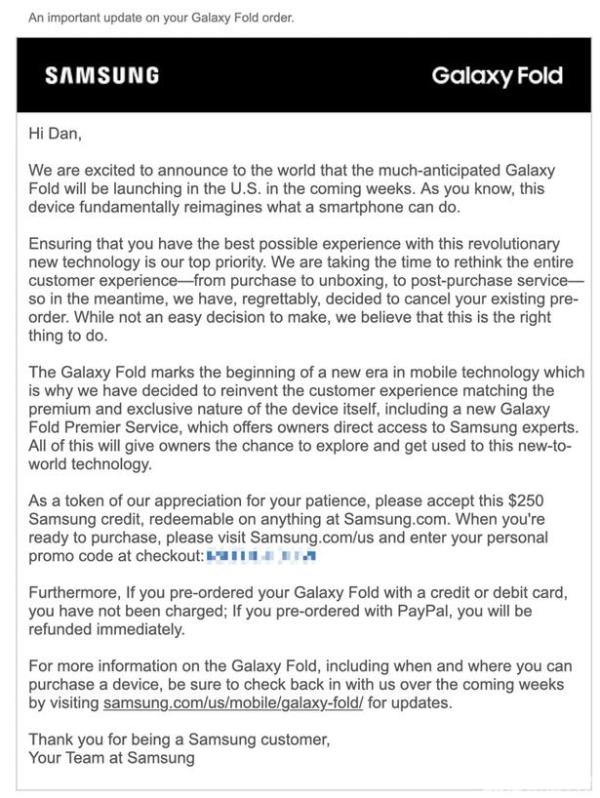 9月6日,三星电子给美国客户发邮件,宣告撤销Galaxy Fold折叠屏在美国的预定,假如想持续购买的用户需求从头下单预定。关于一切撤销的预定客户,三星赠送了价值250美元的三星在线商铺购物金。