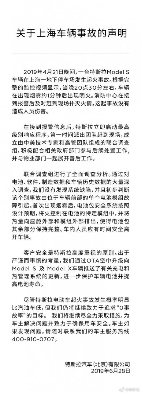 本年 4 月,一辆特斯拉 Model S 在上海徐汇一小区的地下车库产生起火事端,特斯拉今日发布了关于这起事端的