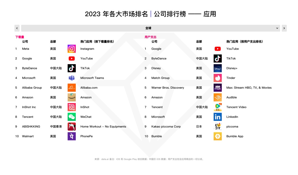 依据 data.ai 发布的陈述,2023 年全球移动使用下载量到达 918 亿次,较 2022 年坚持相等。泛文娱、购物与东西范畴仍旧是最抢手非游戏使用商场。跟着更多用户订阅习气的养成以及产品变现战略的不断测验,包含Google、字节跳动、Disney等闻名公司均完成明显收入增加。